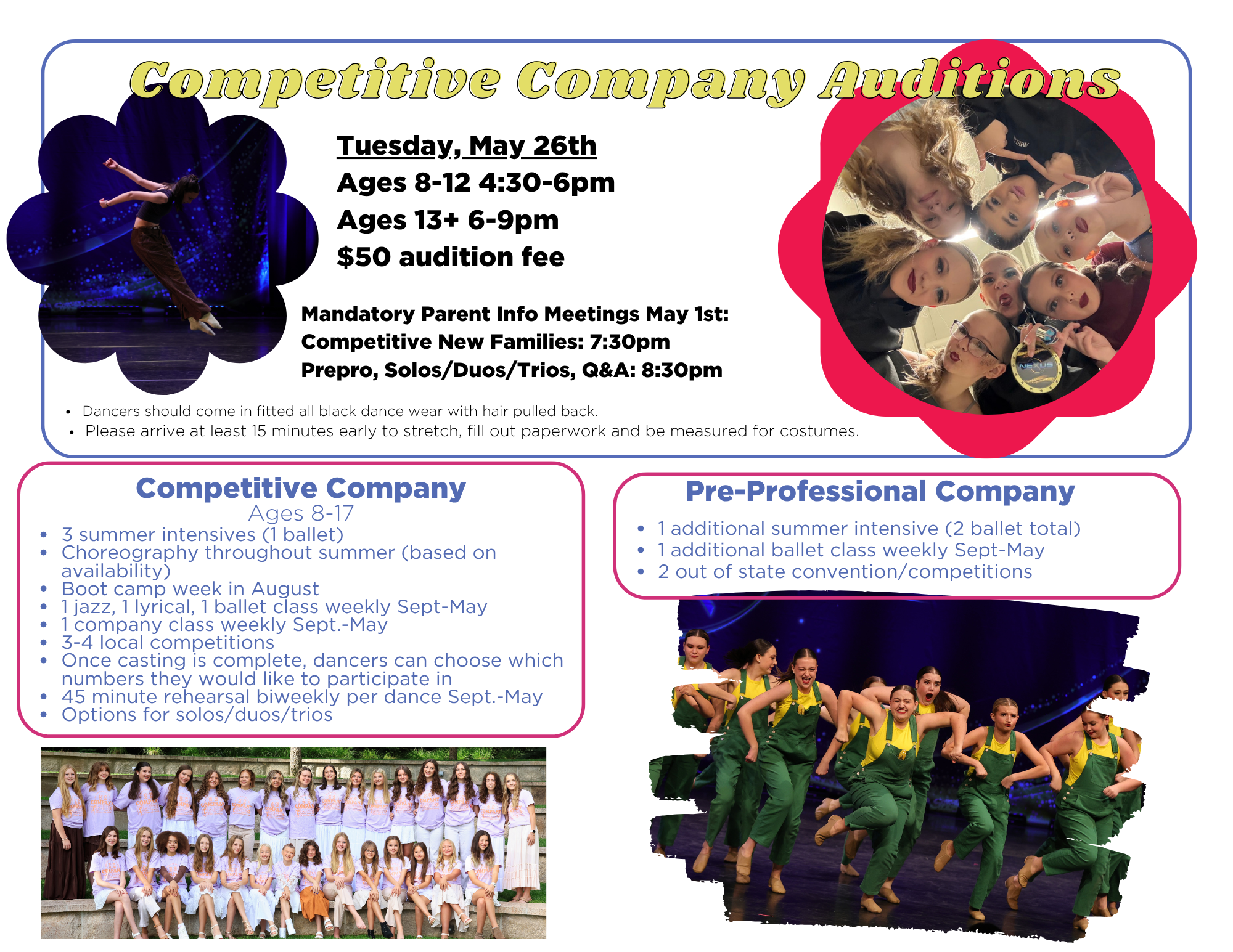 - Weekly classes (September – May): 1 Jazz, 1 Lyrical, 1 Ballet class & 1 Company class
